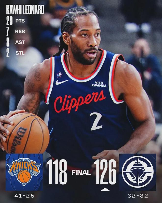 今天这场比赛,伦纳德出战35分钟,投篮19中10,三分5中2,罚球7中7,砍下29分7篮板8助攻2抢断,正负值+26全场最高!伦纳德已经连续42场比赛砍下20+,最近4场,他场均29分7.3篮板3.8助攻2抢断,投篮命中率52.8%。
